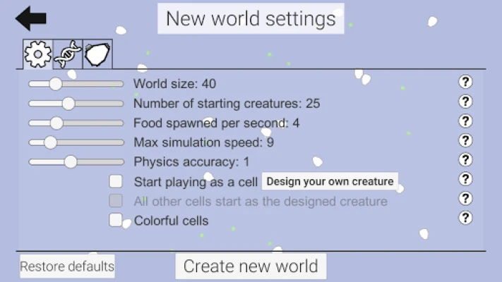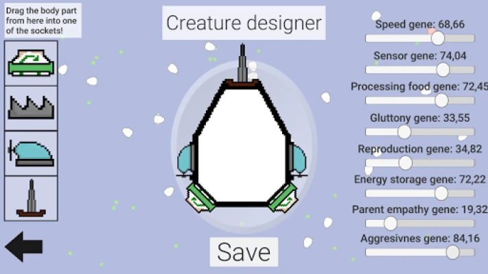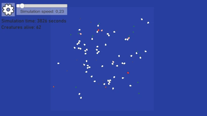 In this evolution simulator, you will be able to observe evolution of simple cells! These cells have their own genes, body parts and internal values which will be changed thanks to evolution and adaptation to the environment. Tweak the simulation values, influence the cells and check their progression! You can also play as a cell and design your own creatures!