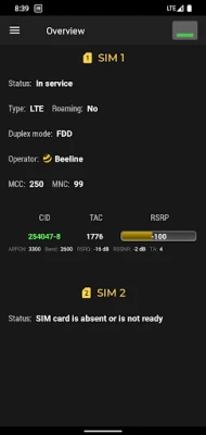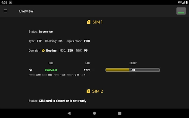 The first tab contains the following information: • Connection status (in service/emergency only/out of service/radio is off) • Operator name and its MCC and MNC • Network technology (GPRS/EDGE/UMTS/LTE) • Current cell identity (CID) • Current area identity (LAC/RNC/TAC) • Signal strength (RSSI and RSRP for LTE networks)