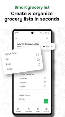 - Smart Shopping Lists: Automatically generate shopping lists by recipe and organize by aisle.